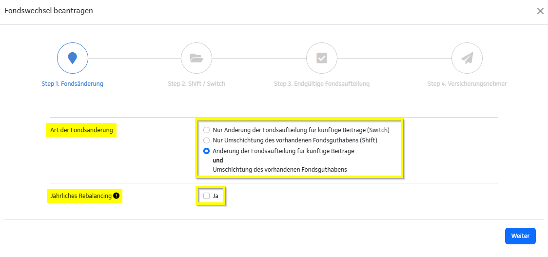 - die Fondsaufteilung für künftige Beiträge ändern (Switch),
