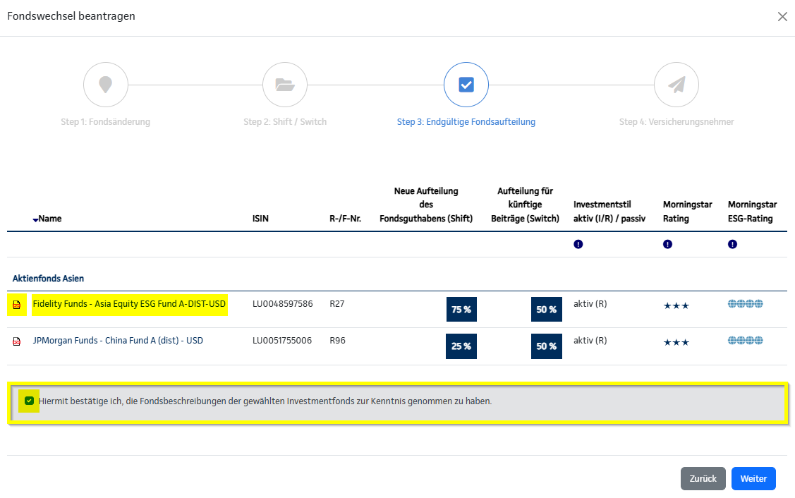 Passt alles? Dann bestätigen Sie, dass Sie die Fondsbeschreibungen zur Kenntnis genommen haben und gehen „Weiter“.