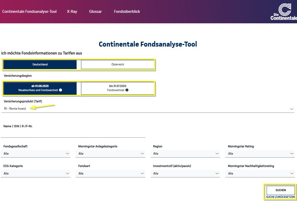 Geben Sie dort Land, Versicherungsbeginn und Tarif ein. Nach einem Klick auf „Suchen“ wird Ihnen die passende Fondsauswahl zu Ihrem Tarif angezeigt.