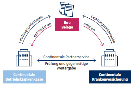- Zeitgleich dazu leitet die Continentale BKK die Belege mit der Angabe der anteiligen BKK-Erstattung an die Continentale Krankenversicherung weiter.