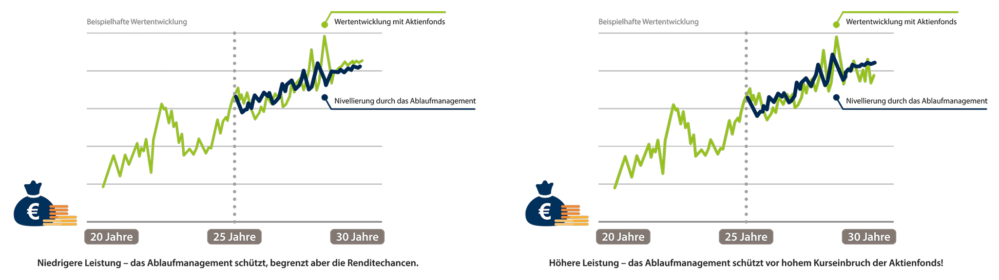 Neigt sich die Ansparphase Ihrer fondsgebundenen Versicherung dem Ende zu, entsteht oft der Wunsch seinem Fondsguthaben mehr Sicherheit zu geben. Genau dafür können Sie unser kostenloses Ablaufmanagement nutzen, das wir Ihnen zum Anspar-Ende automatisch anbieten. Es sorgt für einen planmäßigen schrittweisen Ausstieg aus riskoreicheren Fonds in Fonds mit geringeren Kursschwankungen.