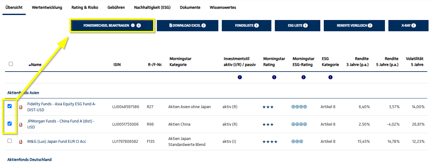 - Wählen Sie bis zu 10 Fonds für Ihren Fondswechsel.