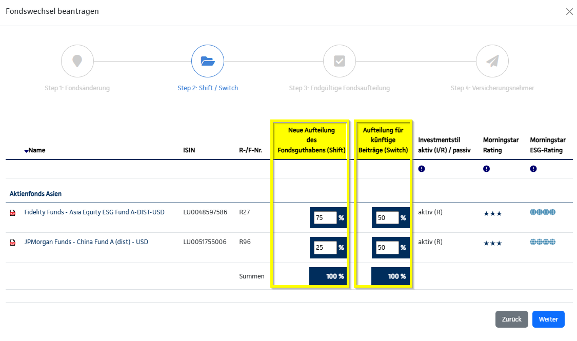 Legen Sie fest, wie Ihre Fondsanteile prozentual verteilt werden sollen – getrennt nach Switch und Shift.