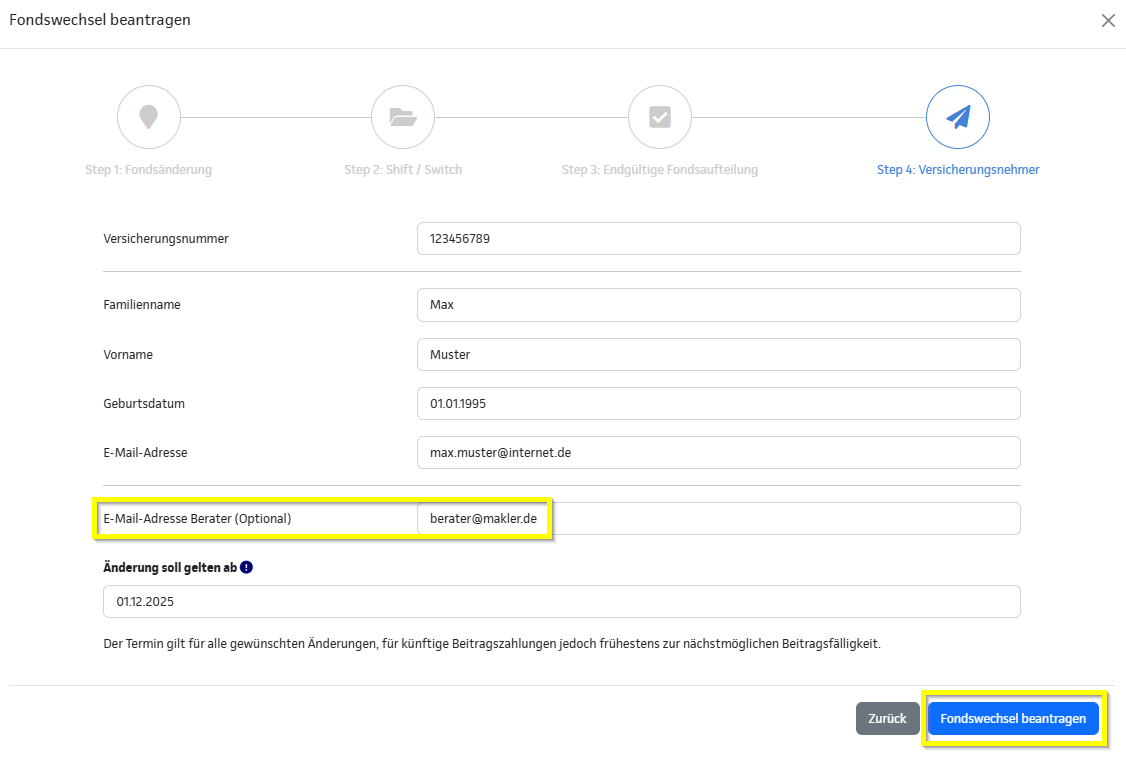- Zum Abschluss klicken Sie auf „Fondswechsel beantragen“.