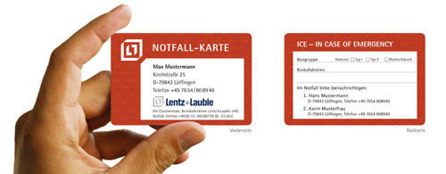 Zum Umfang unseres Notfallservices gehört unsere Notfall-Karte. Sie passt in jeden Geldbeutel und enthält die wichtigsten Angaben für Ersthelfer, wie medizinische Besonderheiten und die Kontaktdaten der Ansprechpartner im Notfall.