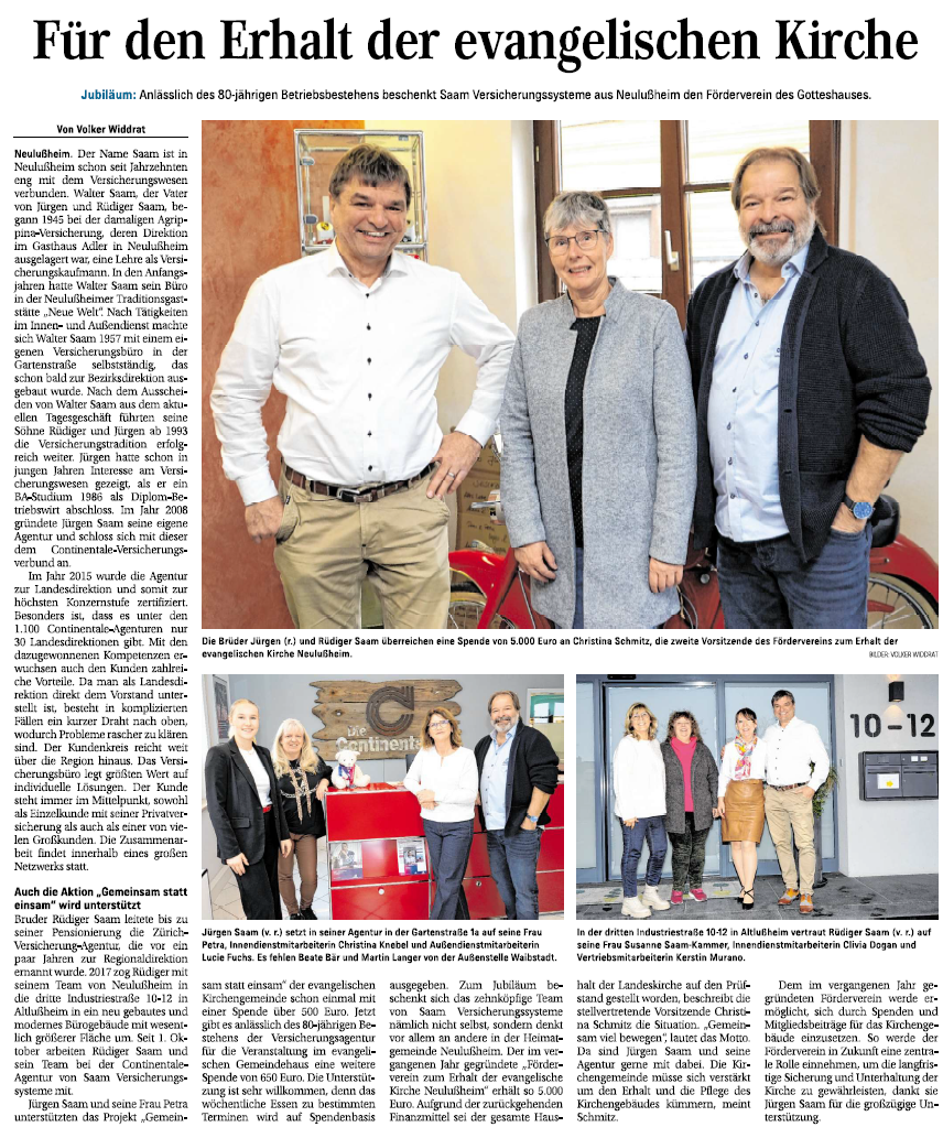 Unser Geschenk zum 80-jährigen Betriebsbestehen der Landesdirektion Saam an den Förderverein des Gotteshauses der evangelischen Kirche