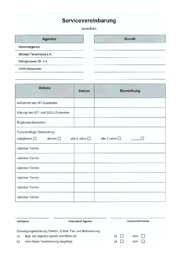 In der Betreuungsvereinbarung wird mit dem Kunden festgelegt wie oft eine regelmäßige Überprüfung der Verträge und Aktualisierung der Verträge notwendig ist.