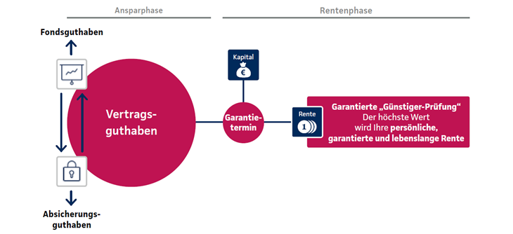 Die erhalten Sie auf alle Fälle wie auch immer sich die Fonds entwickeln. Und bis dahin? Sorgt ein moderner Mechanismus zur Aufteilung des Vertragsguthabens für Bewegung. Die Chancen nutzen und den Risiken ausweichen, für Ihre höchstmögliche Rente – das ist das Ziel.