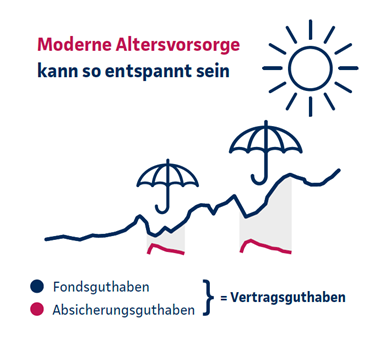 Diese Altersvorsorge braucht keine Entweder-oder-Entscheidung – sie steht für beides: Renditechancen und Garantieleistungen. Deshalb investieren Sie auch gleich ab dem ersten Sparbeitrag in Fonds. Beruhigend dabei: Ihre garantierte Mindestrente zum vereinbarten Rentenbeginn.